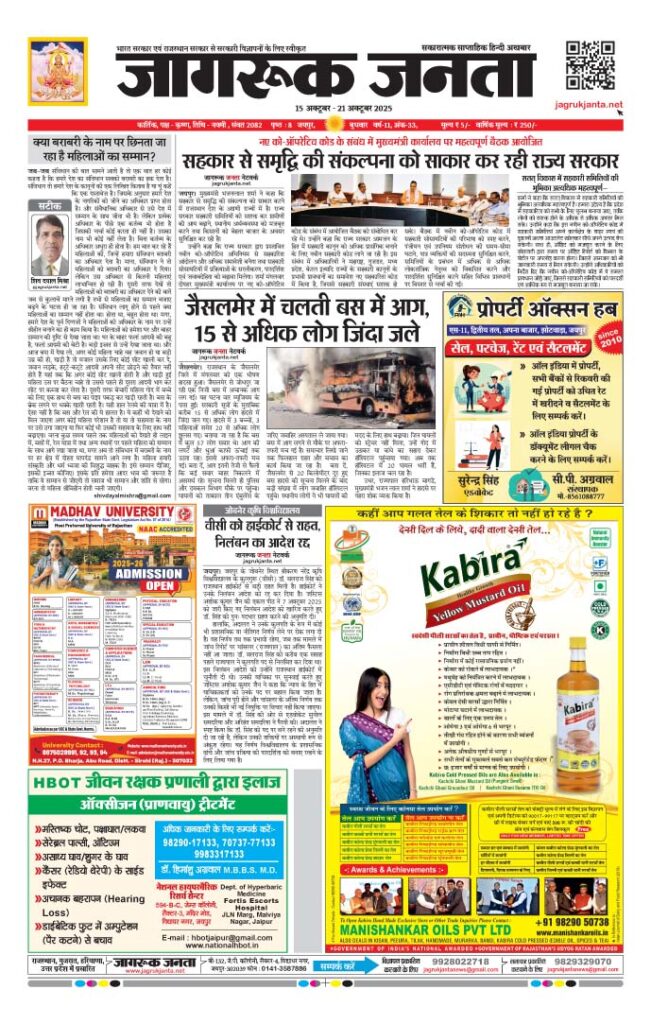 Jagruk Janta Hindi News Paper 15 October 2025 Jagruk Janta 15 October 2025Download By: Jagruk Janta Date: October 15, 2025 Join Our Whatsapp Channel Previous articleBJP प्रदेशाध्यक्ष मदन राठौड़ का बयान, अंता से उम्मीदवार के नाम का एलान आज होगा घोषित Jagruk Janta Share post: FacebookTwitterPinterestWhatsApp SubscribeI want inI've read and accept the Privacy Policy. Popular BJP प्रदेशाध्यक्ष मदन राठौड़ का बयान, अंता से उम्मीदवार के नाम का एलान आज होगा घोषित लायंस क्लब भरतपुर सेंचुरी का अधिष्ठापन राजस्थान के साहित्यकारों का किया सम्मान केन्द्रीय गृह मंत्री अमित शाह ने प्रदेश को दी 9,300 करोड़ रुपये के विकास कार्यों की सौगात दीपावली का त्यौहार शहर की रोड लाइट व्यवस्था बिगड़ी। फौजदार More like thisRelated BJP प्रदेशाध्यक्ष मदन राठौड़ का बयान, अंता से उम्मीदवार के नाम का एलान आज होगा घोषित Jagruk Janta - October 14, 2025 जयपुर: भाजपा प्रदेशाध्यक्ष मदन राठौड़ का बयान देते हुए... लायंस क्लब भरतपुर सेंचुरी का अधिष्ठापन Jagruk Janta - October 13, 2025 लायंस क्लब भरतपुर सेन्चुरी की छटवीं पदस्थापना का भव्य... राजस्थान के साहित्यकारों का किया सम्मान Jagruk Janta - October 13, 2025 राजस्थान जन सांस्कृतिक परिषद् के तत्वावधान में आयोजित 'लोहागढ़... केन्द्रीय गृह मंत्री अमित शाह ने प्रदेश को दी 9,300 करोड़ रुपये के विकास कार्यों की सौगात Jagruk Janta - October 13, 2025 4 लाख करोड़ रुपये के निवेश एमओयू की हुई...