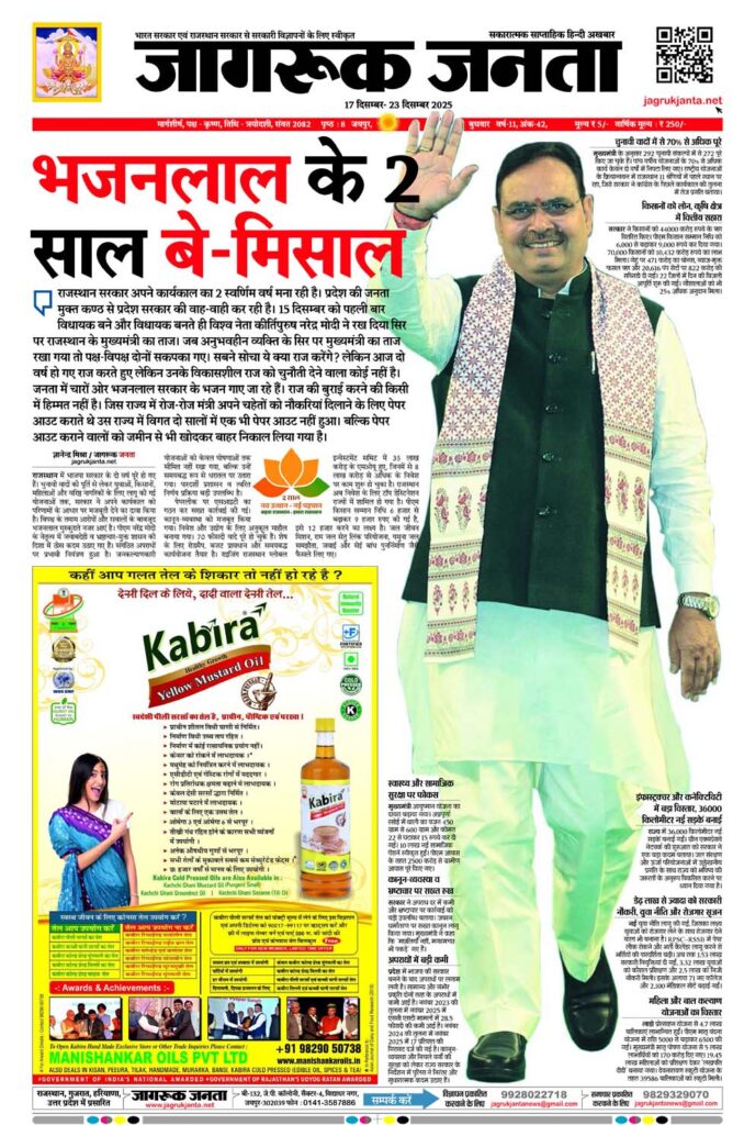 Jagruk Janta Hindi News Paper 17 December 2025 By: Jagruk Janta Date: December 17, 2025 Join Our Whatsapp Channel Previous article22 दिसंबर से खुल रहा Shyam धानी इंडस्ट्रीज Limited का IPO, प्राइस बैंड ₹70, ग्रेमार्केट में अभी से ही तेजी Jagruk Janta Share post: FacebookTwitterPinterestWhatsApp SubscribeI want inI've read and accept the Privacy Policy. Popular 22 दिसंबर से खुल रहा Shyam धानी इंडस्ट्रीज Limited का IPO, प्राइस बैंड ₹70, ग्रेमार्केट में अभी से ही तेजी श्री साकेत पंचांग, Bundi से पधारे ज्योतिषाचार्य Akhsay शास्त्री देशभर के विद्वानों के बीच हुए विशिष्ट रूप से सम्मानित साफा व दुपट्टा पहनाकर आत्मीय एवं गरिमामय स्वागत से गदगद हुए राजस्थानी प्रवासी राधागोविन्द Public चैरिटेबल ट्रस्ट द्वारा सरकारी उच्च माध्यमिक विद्यालय में Computer लैब एवं पुस्तकालय की स्थापना Biyani कॉलेज ऑफ़ साइंस एंड मैनेजमेंट के छात्रों ने ग्रामीण Bharat को बनाया स्वस्थ और जागरूक More like thisRelated 22 दिसंबर से खुल रहा Shyam धानी इंडस्ट्रीज Limited का IPO, प्राइस बैंड ₹70, ग्रेमार्केट में अभी से ही तेजी Jagruk Janta - December 16, 2025 कंपनी का यह इश्यू 22 दिसंबर 2025 को सब्सक्रिप्शन... श्री साकेत पंचांग, Bundi से पधारे ज्योतिषाचार्य Akhsay शास्त्री देशभर के विद्वानों के बीच हुए विशिष्ट रूप से सम्मानित Jagruk Janta - December 15, 2025 सवाईमाधोपुर। रणथंभौर रोड स्थित आयोजन स्थल पर रविवार को... साफा व दुपट्टा पहनाकर आत्मीय एवं गरिमामय स्वागत से गदगद हुए राजस्थानी प्रवासी Jagruk Janta - December 15, 2025 जयपुर. प्रवासी राजस्थानी दिवस जयपुर पधारे सभी देश-विदेश के... राधागोविन्द Public चैरिटेबल ट्रस्ट द्वारा सरकारी उच्च माध्यमिक विद्यालय में Computer लैब एवं पुस्तकालय की स्थापना Jagruk Janta - December 15, 2025 जयपुर : जगद्गुरु श्री कृपालु जी महाराज की प्रचारिका...