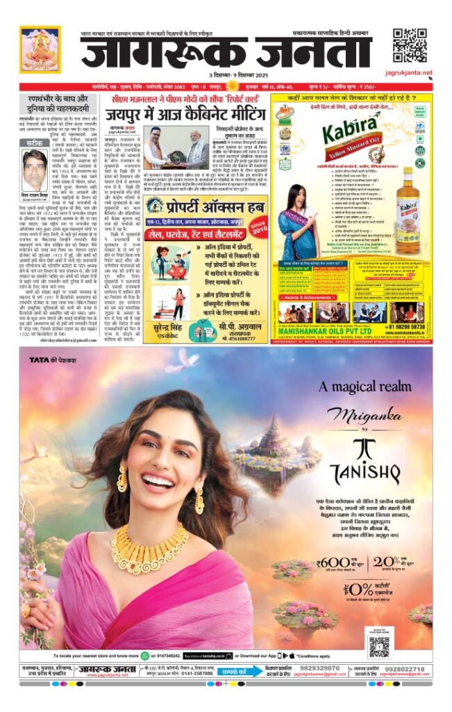 Jagruk Janta Hindi News Paper 3 December 2025 Jagruk Janta 03 December 2025Download By: Jagruk Janta Date: December 3, 2025 Join Our Whatsapp Channel Previous articleतोरण द्वार नीव मुहूर्त 6 को, 19 को निशान यात्रा व रथयात्रा एवं 20 को श्री श्याम संकीर्तन को होगा आयोजन Jagruk Janta Share post: FacebookTwitterPinterestWhatsApp SubscribeI want inI've read and accept the Privacy Policy. Popular तोरण द्वार नीव मुहूर्त 6 को, 19 को निशान यात्रा व रथयात्रा एवं 20 को श्री श्याम संकीर्तन को होगा आयोजन बदल गया राजस्थान के राजभवन का नाम, अब तक 9 राज्यों में हो चुका है बदलाव Petrol डालकर जलाए गए प्रेमी ने जयपुर में तोड़ा दम, जिंदगी की जंग लड़ रही प्रेमिका Rajasthan CM Delhi Visit: PM मोदी से मिलेंगे CM भजनलाल! रिफाइनरी और राजस्थान के लिए दिल्ली का क्या है ‘सीक्रेट प्लान’? आसाराम की जमानत के खिलाफ सुप्रीम Court पहुंची रेप पीड़िता, रद्द करने की मांग More like thisRelated तोरण द्वार नीव मुहूर्त 6 को, 19 को निशान यात्रा व रथयात्रा एवं 20 को श्री श्याम संकीर्तन को होगा आयोजन Jagruk Janta - December 2, 2025 अलवर. आप सभी को जानकर हर्ष होगा कि अलवर... बदल गया राजस्थान के राजभवन का नाम, अब तक 9 राज्यों में हो चुका है बदलाव Jagruk Janta - December 2, 2025 Raj bhavan Rename: अब तक उत्तराखंड, पश्चिम बंगाल, त्रिपुरा,... Petrol डालकर जलाए गए प्रेमी ने जयपुर में तोड़ा दम, जिंदगी की जंग लड़ रही प्रेमिका Jagruk Janta - December 2, 2025 Lover Burnt Alive Case: जयपुर के मौखमपुरा थाना क्षेत्र... Rajasthan CM Delhi Visit: PM मोदी से मिलेंगे CM भजनलाल! रिफाइनरी और राजस्थान के लिए दिल्ली का क्या है ‘सीक्रेट प्लान’? Jagruk Janta - December 2, 2025 Bhajanlal Sharma in Delhi: मुख्यमंत्री भजनलाल शर्मा का यह...