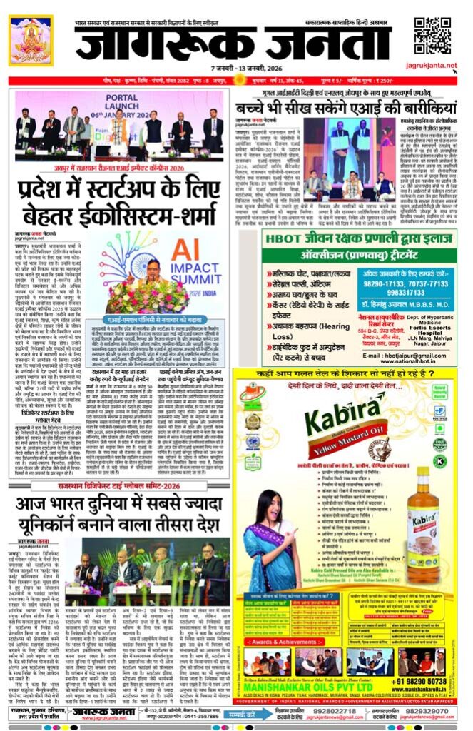 Jagruk Janta Hindi News Paper 7 January 2026 Jagruk Janta 7 January 2026Download By: Jagruk Janta Date: January 7, 2026 Join Our Whatsapp Channel Previous articleJagruk Janta Hindi News Paper 31 December 2025 Jagruk Janta Share post: FacebookTwitterPinterestWhatsApp SubscribeI want inI've read and accept the Privacy Policy. Popular Jagruk Janta Hindi News Paper 31 December 2025 तू-तू, मैं-मैं के बीच ‘लड़ना है तो बाहर आ जा’, BAP विधायक ने बीजेपी सांसद को धमकाया…. नए साल पर खाटूश्यामजी दर्शन करने जा रहे तो जरूर पढ़ें ये खबर, Mandir कमेटी ने कर दिया अलर्ट जसोल Dham में Somnath ज्योतिर्लिंग के पावन अंश के दिव्य दर्शन माउंट abu की पर्वतीय वादियों से शुरू हुआ aravli बचाओ अभियान More like thisRelated Jagruk Janta Hindi News Paper 31 December 2025 Jagruk Janta - December 31, 2025 तू-तू, मैं-मैं के बीच ‘लड़ना है तो बाहर आ जा’, BAP विधायक ने बीजेपी सांसद को धमकाया…. Jagruk Janta - December 29, 2025 बांसवाड़ा में बैठक के दौरान बीएपी सांसद राजकुमार रोत... नए साल पर खाटूश्यामजी दर्शन करने जा रहे तो जरूर पढ़ें ये खबर, Mandir कमेटी ने कर दिया अलर्ट Jagruk Janta - December 28, 2025 खाटूश्यामजी में VIP दर्शन के नाम पर पैसा मांगने... जसोल Dham में Somnath ज्योतिर्लिंग के पावन अंश के दिव्य दर्शन Jagruk Janta - December 25, 2025 सनातन आस्था, आध्यात्मिक चेतना एवं सांस्कृतिक वैभव का ऐतिहासिक...