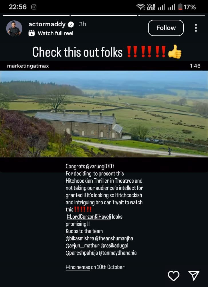 मशहूर अभिनेता आर. माधवन ने सोशल मीडिया पर ब्लैक-कॉमेडी थ्रिलर ‘लॉर्ड कर्ज़न की हवेली’ की तारीफ़ करते हुए विशेष रूप से मैक्स मार्केटिंग के फ़ाउंडर वरुण गुप्ता की सराहना की, जिन्होंने इस फ़िल्म को सिनेमाघरों में रिलीज़ करने की पहल की है।