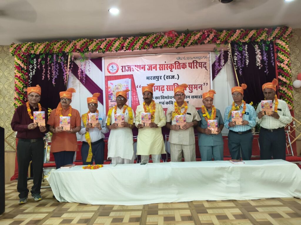 राजस्थान जन सांस्कृतिक परिषद् के तत्वावधान में आयोजित ‘लोहागढ़ साहित्य सुमन’ पुस्तक का विमोचन, साहित्यकार सम्मान एवं काव्य गोष्ठी का आयोजन रविवार को भव्यता के साथ सम्पन्न हुआ। साहित्यकारों द्वारा रचित रचनाओं का संकलन जिसमें गद्य एवं पद्य दोनों विधाओ में संकलित ‘‘लोहागढ़ साहित्य सुमन’’ पुस्तक का मंचस्थ मुख्य अतिथि सुनील प्रधान, परिषद् के प्रांतीय अध्यक्ष एवं वरिष्ठ साहित्यकार वेदप्रकाश वेद की अध्यक्षता में एवं प्रांतीय सचिव राजेन्द्र अनुरागी,उपाध्यक्ष हरीश चन्द शर्मा ‘हरि’, श्यामसिंह जघीना, देवेन्द्र चामड, जिलाध्यक्ष प्रोफेसर डॉ.अशोक कुमार गुप्ता, जिला सचिव लोकेश सिंघल के विशिष्ठ आतिथ्य में साझा संकलन पुस्तक का विमोचन हुआ। कार्यक्रम का शुभारंभ मां सरस्वती के समक्ष दीप प्रज्ज्वलन एवं कवि गोविन्द सिंह डागुर की सरस्वती वन्दना से हुआ। परिषद् द्वारा मंचस्थ अतिथियों का दिलीप गुप्ता, देवेन्द्र सिंह, सी.एस. कृष्णा, राकेश राजस्थानी, अभिषेक अमर, प्रियंका देवी एवं मोनिका सिंघल द्वारा माला,साफा पहनाकर स्वागत सम्मान किया। जिला सचिव लोकेश सिंघल ने बताया कि यह कार्यक्रम तीन सत्रों में सम्पन्न हुआ। प्रथम सत्र में साझा संकलन ‘लोहागढ़ साहित्य सुमन’, वेदप्रकाश वेद द्वारा ‘‘शब्दों के किरदार, श्यामलाल सैनी द्वारा रचित ‘‘बहते झरने भावों के’’ अनीता सिंह सुरभि द्वारा – ‘‘रजत रश्मि’’ डा. शैलेश तिवारी – ‘‘सुनो मन’’ पुस्तकों के विमोचन से हुआ। कार्यक्रम के द्वितीय सत्र में राजस्थान के विभिन्न क्षेत्रों से पधारे 61 साहित्कारों का सम्मान किया गया। जिसमें मंचस्थ अतिथियों द्वारा उन्हें माला, साफा, पटका, गणेश जी का चित्र, पुस्तक एवं अभिनन्दन पत्र प्रदान किया गया।इस अवसर पर प्रत्येक साहित्यकार को उनके द्वारा की जा रही साहित्य साधना के लिए ‘लोहागढ़ साहित्य मनीषी’ की उपाधि से विभूषित किया गया।परिषद् के प्रांतीय सचिव राजेन्द्र अनुरागी द्वारा परिषद् के क्रिया कलापों का परिचय एवं विस्तृत प्रतिवेदन प्रस्तुत किया गया। साहित्यकारों को पुरस्कार प्रदान करते हुए कार्यक्रम के मुख्य अतिथि सुनील प्रधान ने आह्वान किया कि आज के पारिवारिक एवं सामाजिक विघटन के दौर में भटकते युवाओं पर अपनी लेखनी के माध्यम से कवियों द्वारा इन्हें मार्गदर्शन मिले ऐसी रचनाओं की आज बेहद आवश्यकता है। उन्होंने इस अवसर पर समाज में कवियों के योगदान की भूरी-भूरी प्रशंसा करते हुए कहा कि जहांँ न पहुंँचे रवि वहांँ पहुंचे कवि आज सही चरितार्थ है।तीसरे सत्र में काव्य गोष्ठी आयोजित हुई। जिसमें साहित्यकार मनमोहन अभिलाषी – ‘‘एक दिन सुमन’’ लोकेश सिंघल – ‘‘छोटौ सौ मौहल्ला’’ राजेन्द्र अनुरागी – ‘‘मेरौ मन वृन्दावन’